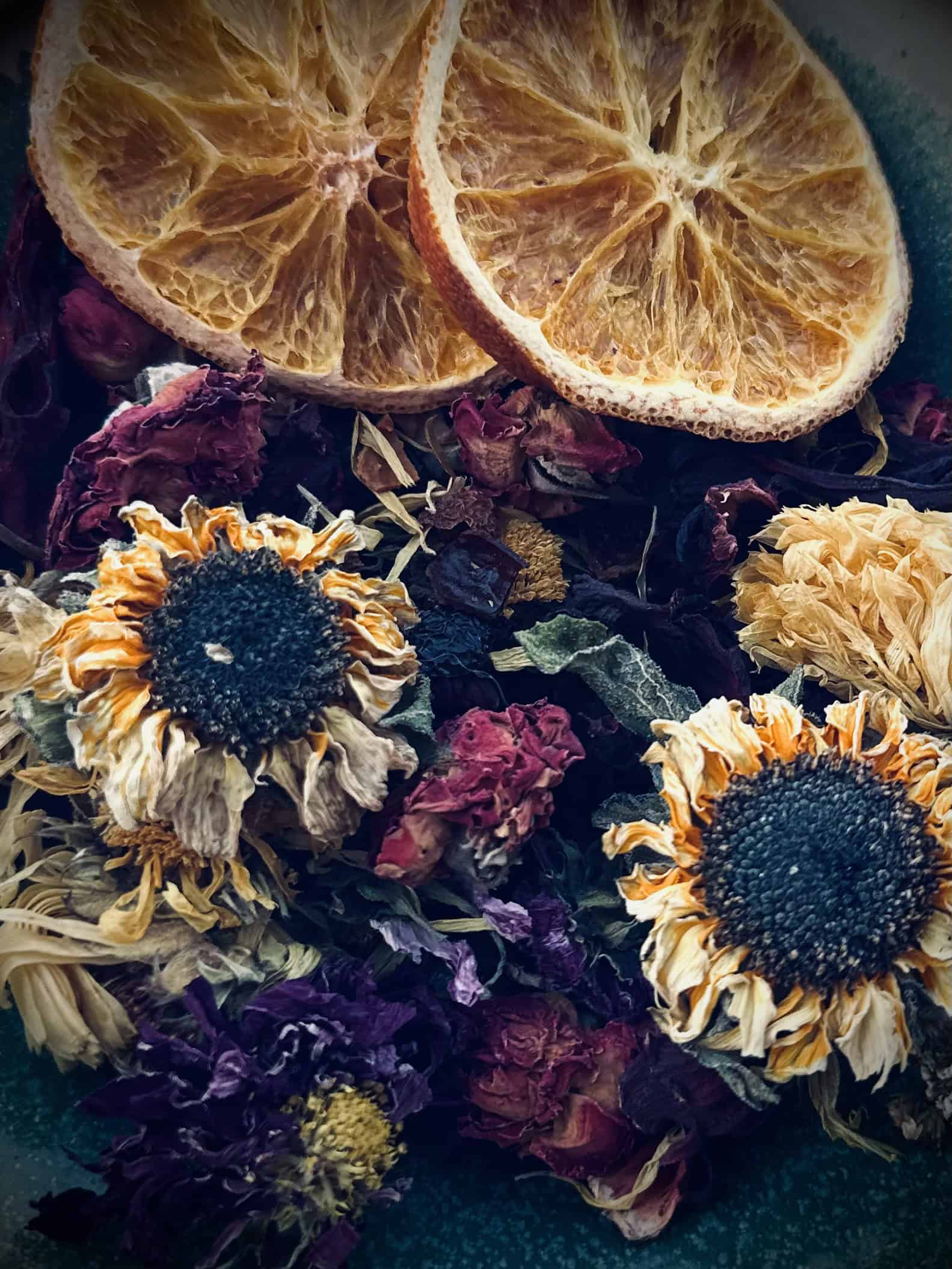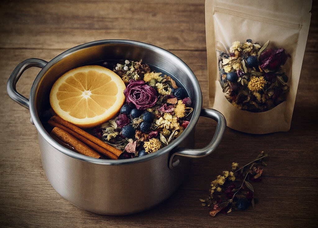 Each simmer pot includes hand-harvested dried flowers, herbs, and berries grown on our Alaskan farm, paired with organic citrus slices and cinnamon sticks for a warm, seasonal fragrance.