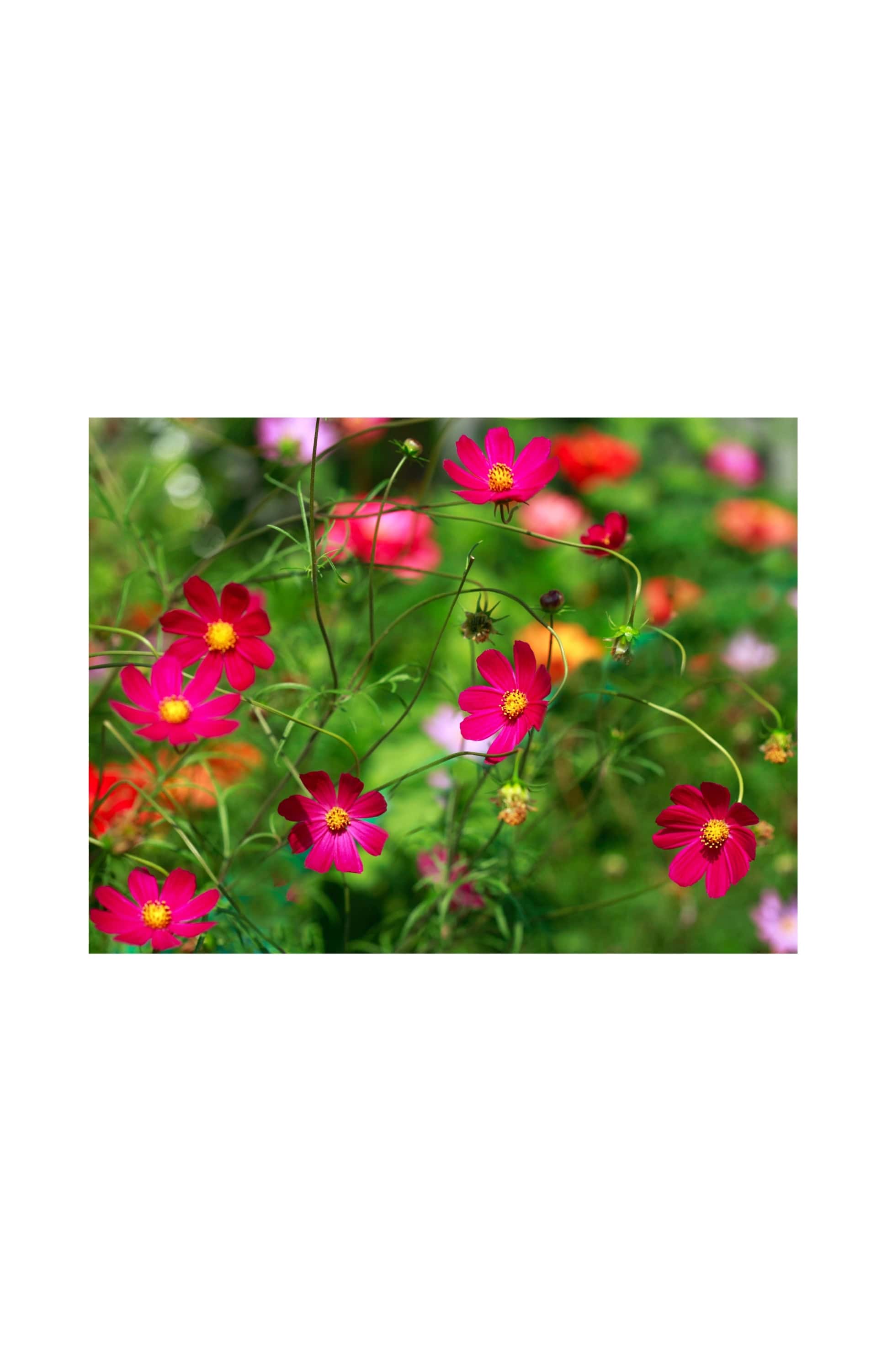 Poppies and snapdragons bloom first, , followed by cosmos, strawflowers, and sunflowers through mid-September.