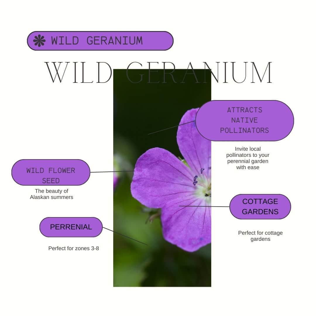 Wild Geranium Alaska Native Flower (Geranium erianthum) Alaska’s natural beauty with your very own Geranium erianthum, commonly known as the Wild Geranium. This enchanting bloom, native to the pristine wilderness of Alaska, offers a unique opportunity to bring a piece of the wild into your garden. Known for its resilience and captivating beauty, the Wild Geranium is more than just a plant; it’s a testament to the rugged, untamed spirit of the north.